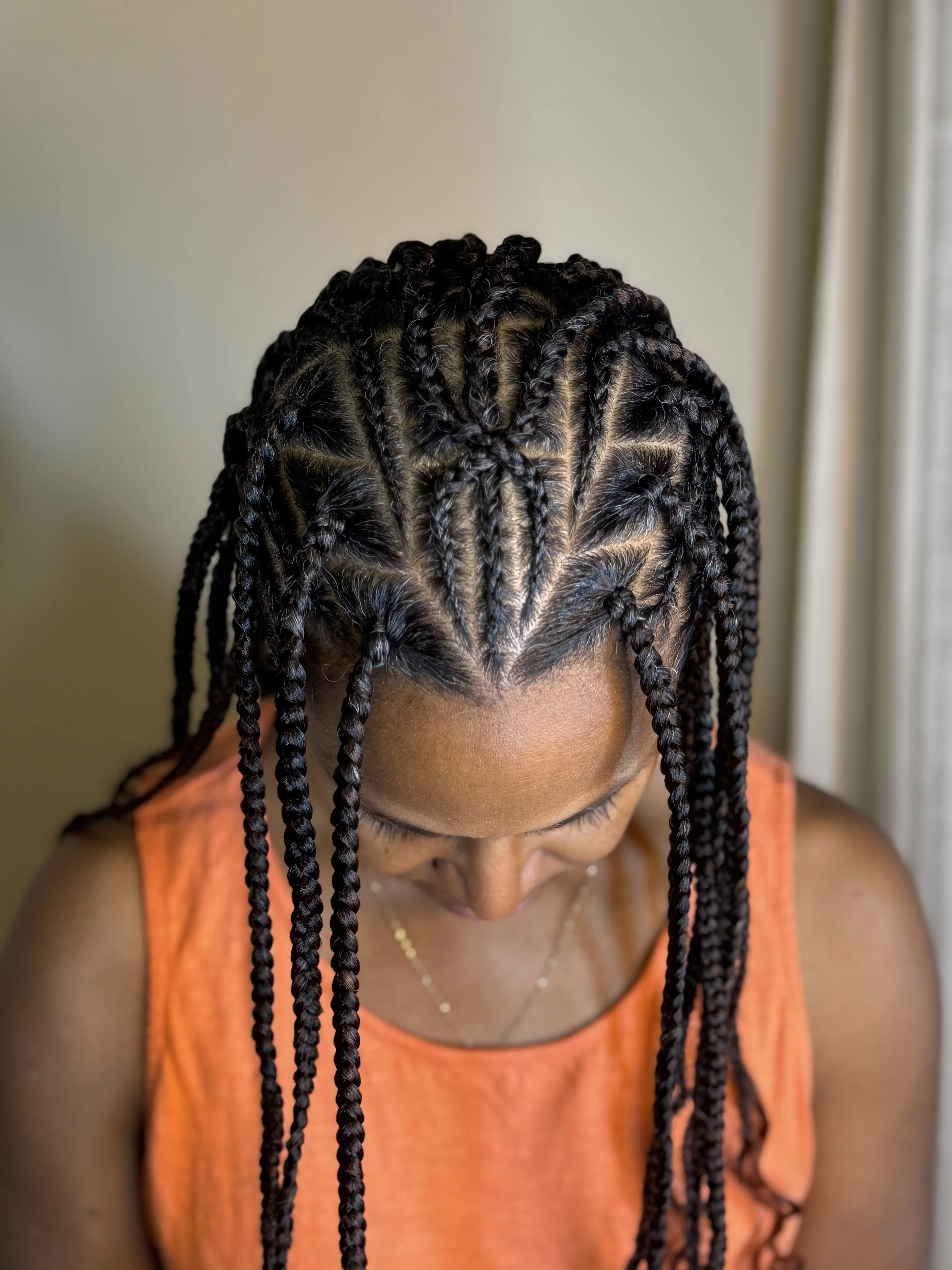 Large Knotless Braids natural-looking protective style giving you versatility while promoting length retention. This technique uses a seamless feed-in method for lighter weight and improved comfort compared with traditional box braided installations.