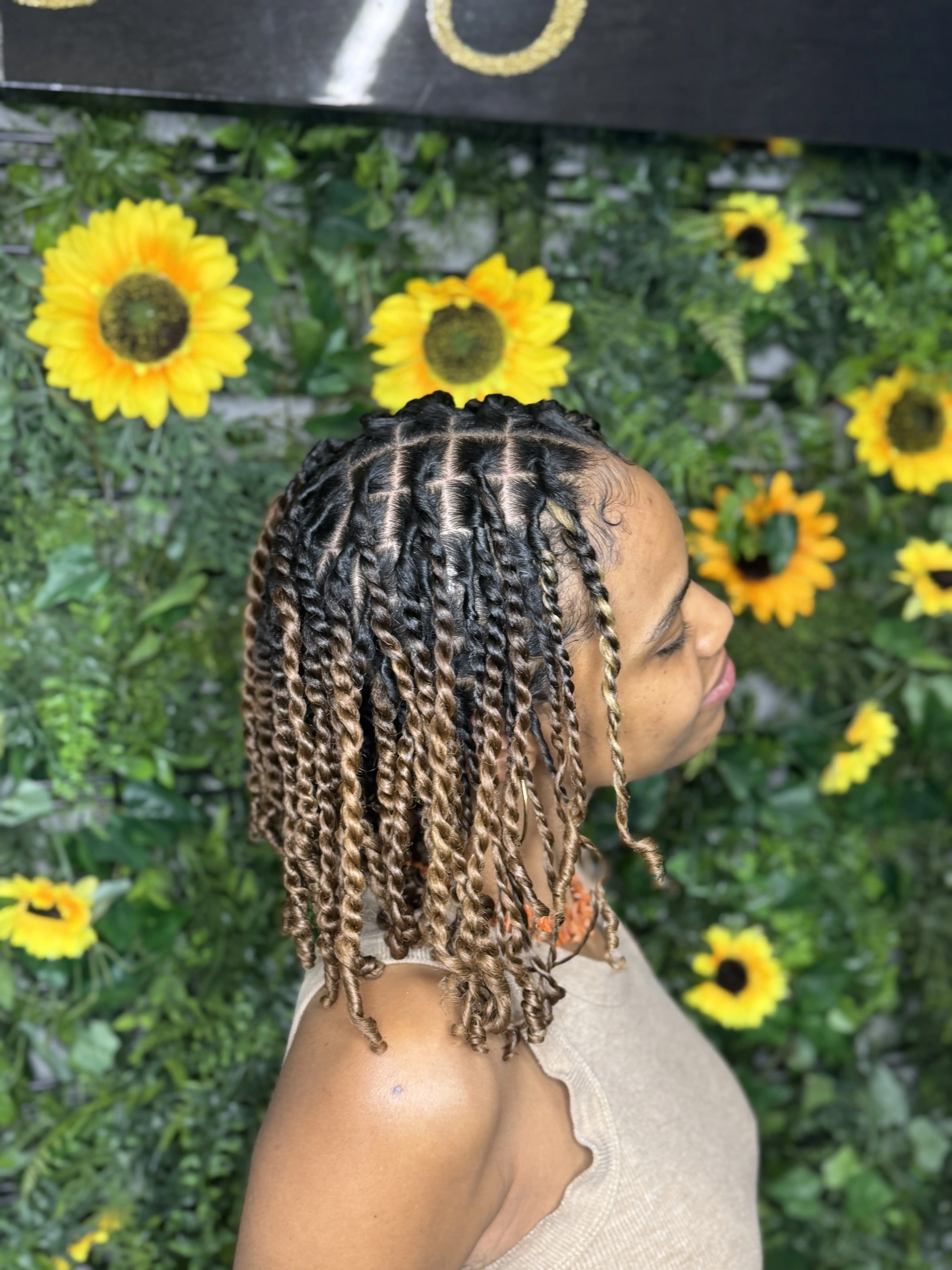 Two-Strand Twist for client with the sides of their hair shaved this service begins with a secure braid base to ensure a long-lasting, polished style. The appointment includes a thorough wash, enhance manageability, and promote healthy shine.