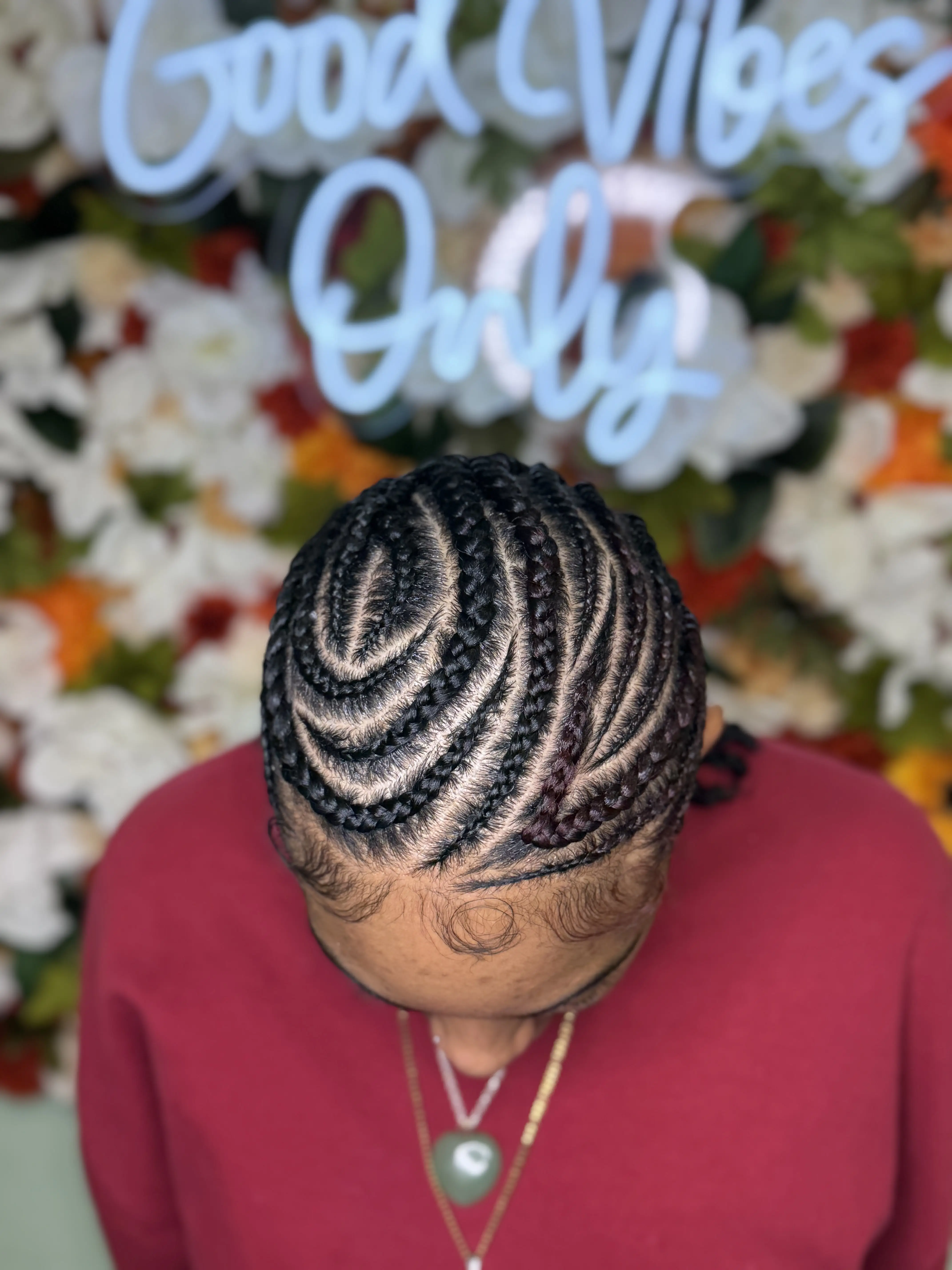 Designer cornrow service for clients with the sides of their hair shaved, includes a professional wash to ensure a clean, healthy foundation before styling. I create precise, customized parting and pattern options to suit your personal style.